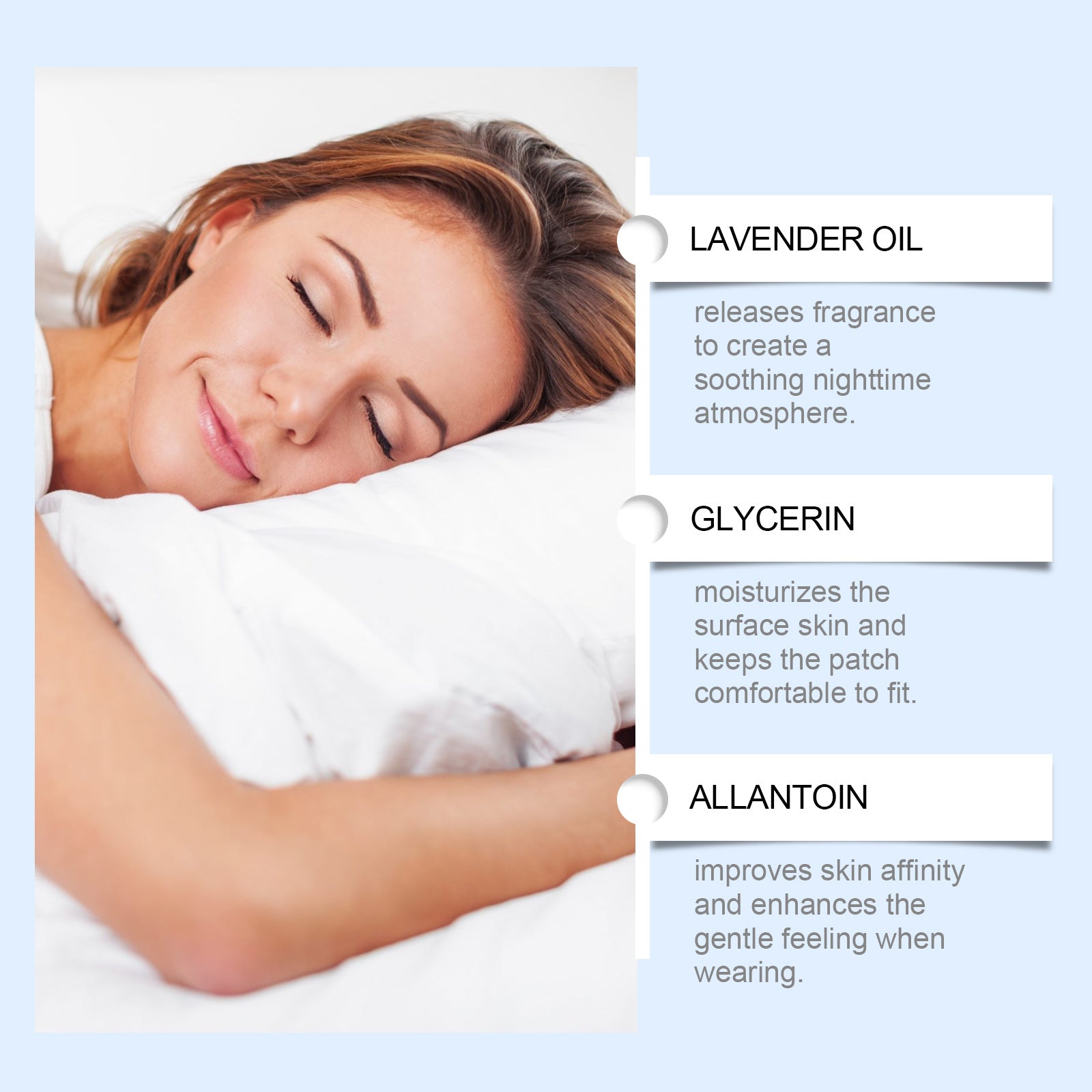 All active ingredients are in the middle layer. Once the protective film is peeled off and the contact layer is revealed, they will slowly seep into your body through the night.